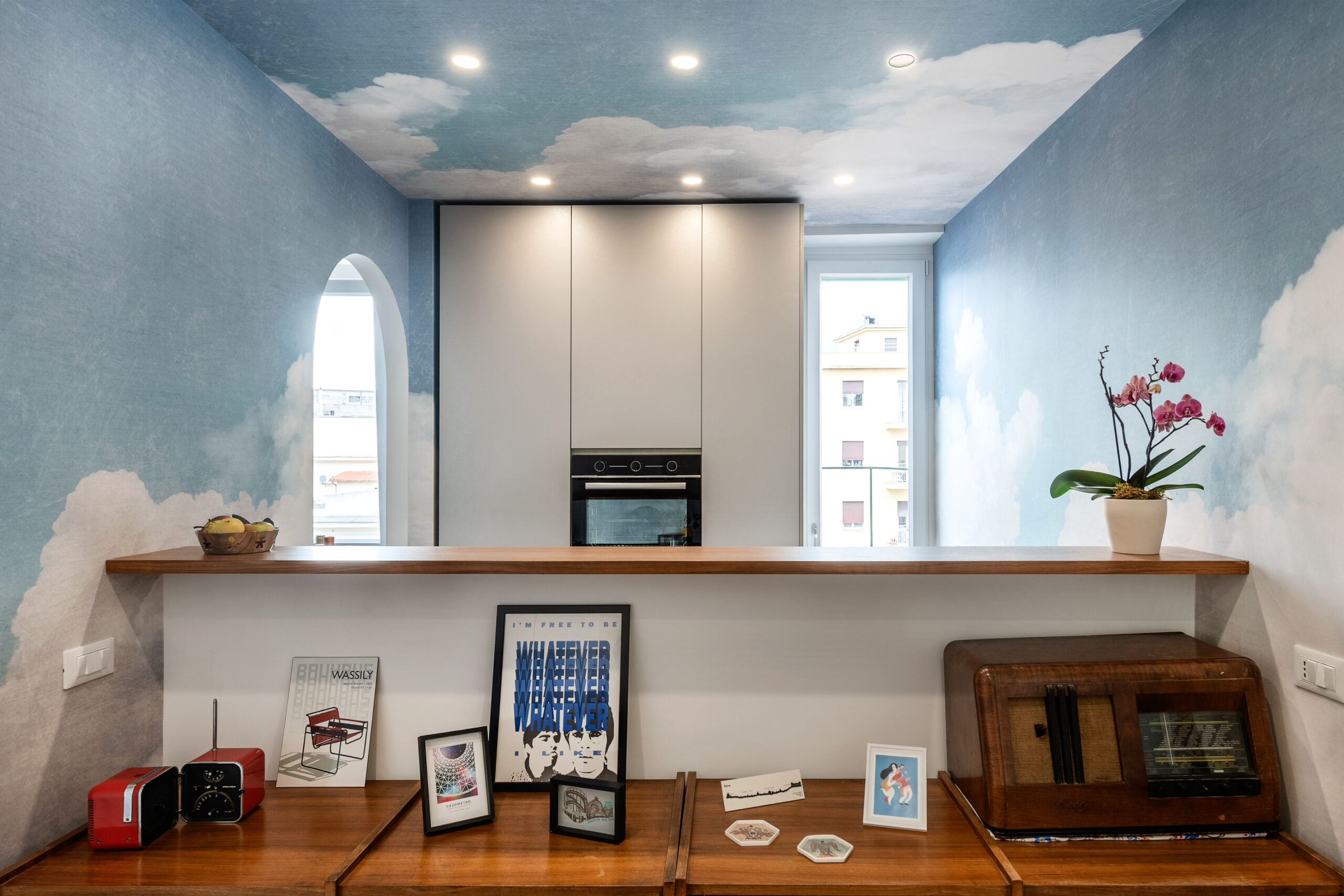 L’ingresso introduce alla zona giorno, dove un divisorio basso separa visivamente la cucina, schermando la zona operativa senza interrompere la continuità spaziale. La cucina, caratterizzata da superfici in acciaio satinato, dialoga con il soggiorno-pranzo attraverso un arco che ne definisce la connessione, enfatizzando la permeabilità tra gli ambienti. I materiali scelti con cura – dal legno teak alla carta da parati a tema nuvole – creano un equilibrio tra texture naturali e suggestioni oniriche.