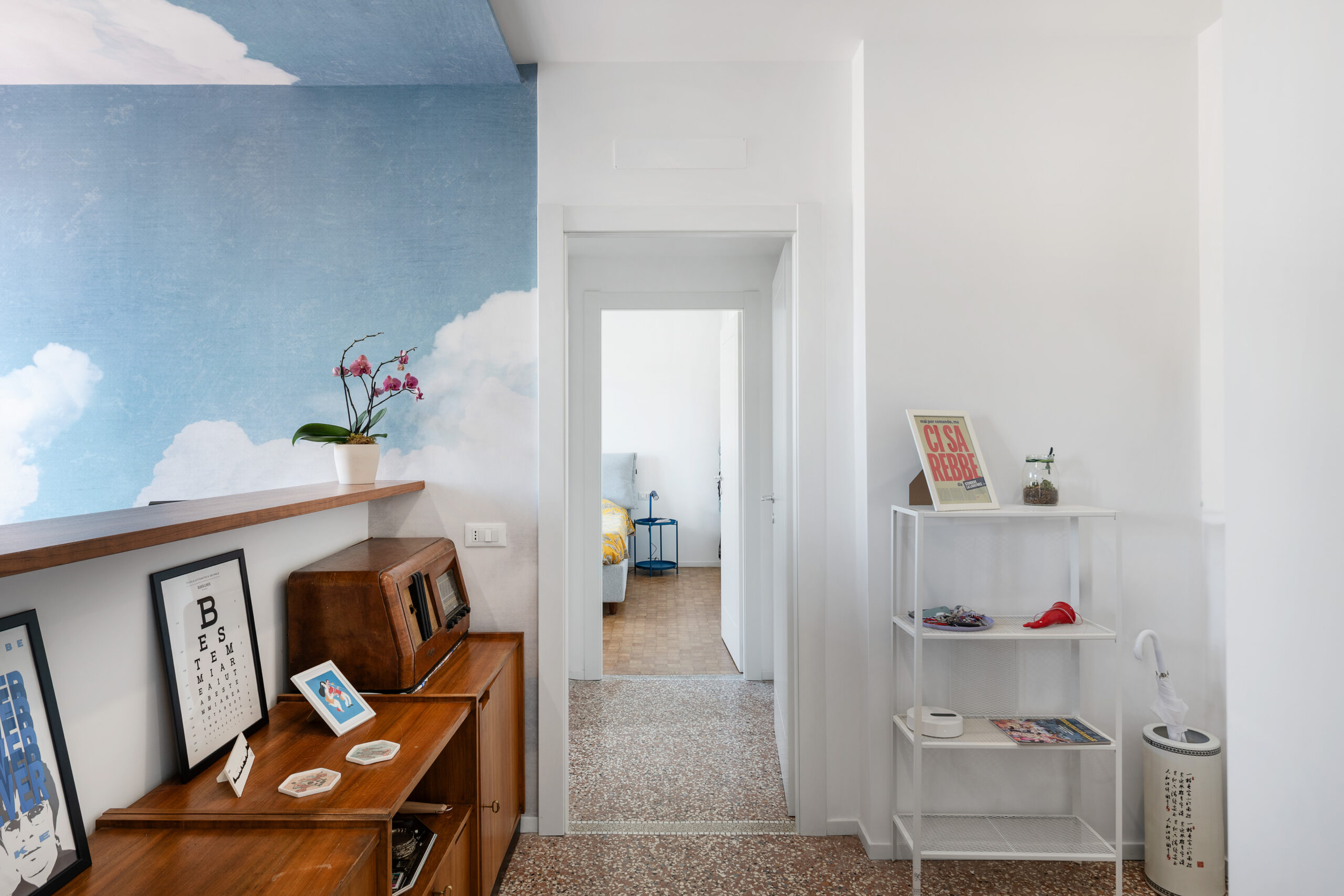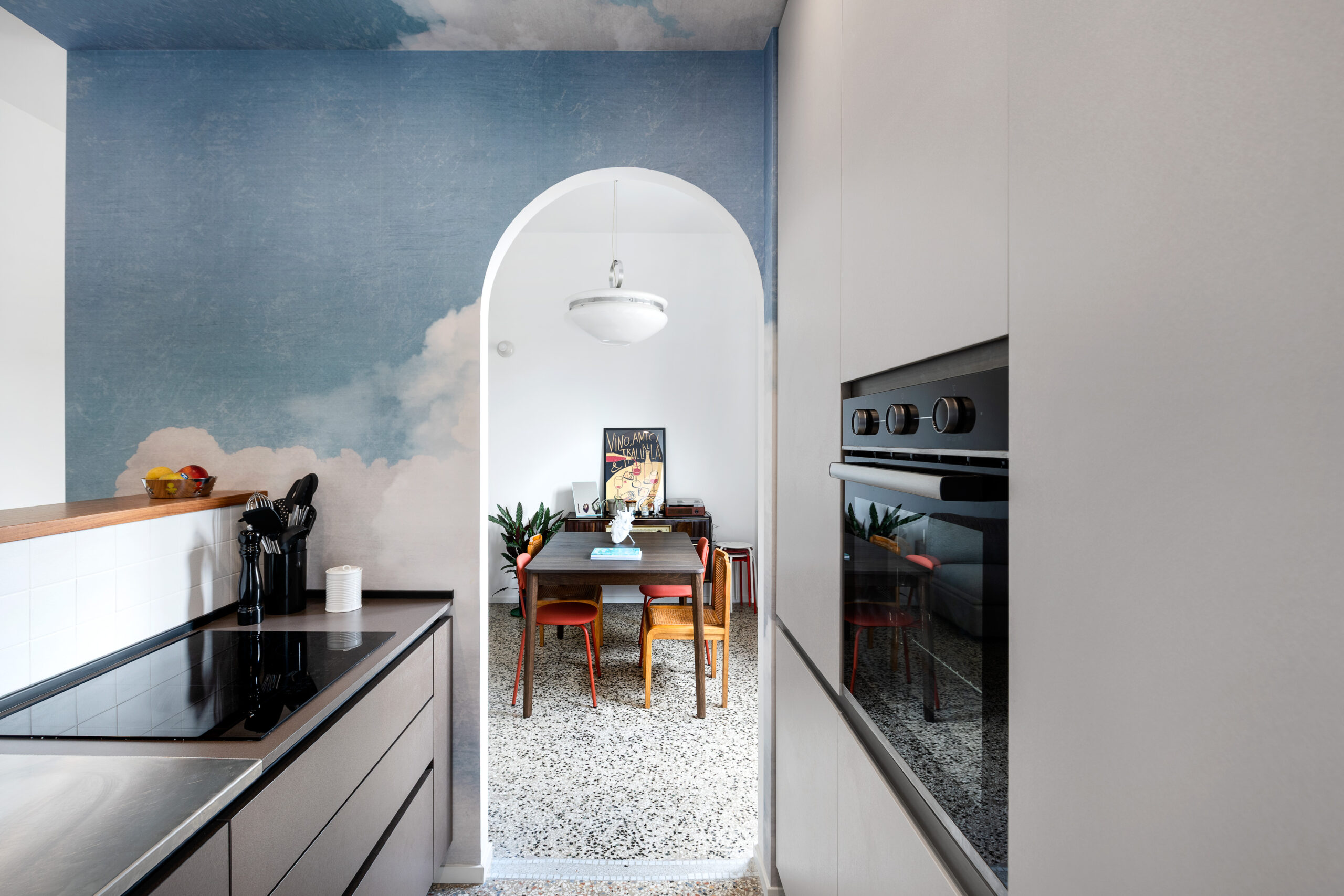 L’ingresso introduce alla zona giorno, dove un divisorio basso separa visivamente la cucina, schermando la zona operativa senza interrompere la continuità spaziale. La cucina, caratterizzata da superfici in acciaio satinato, dialoga con il soggiorno-pranzo attraverso un arco che ne definisce la connessione, enfatizzando la permeabilità tra gli ambienti. I materiali scelti con cura – dal legno teak alla carta da parati a tema nuvole – creano un equilibrio tra texture naturali e suggestioni oniriche.