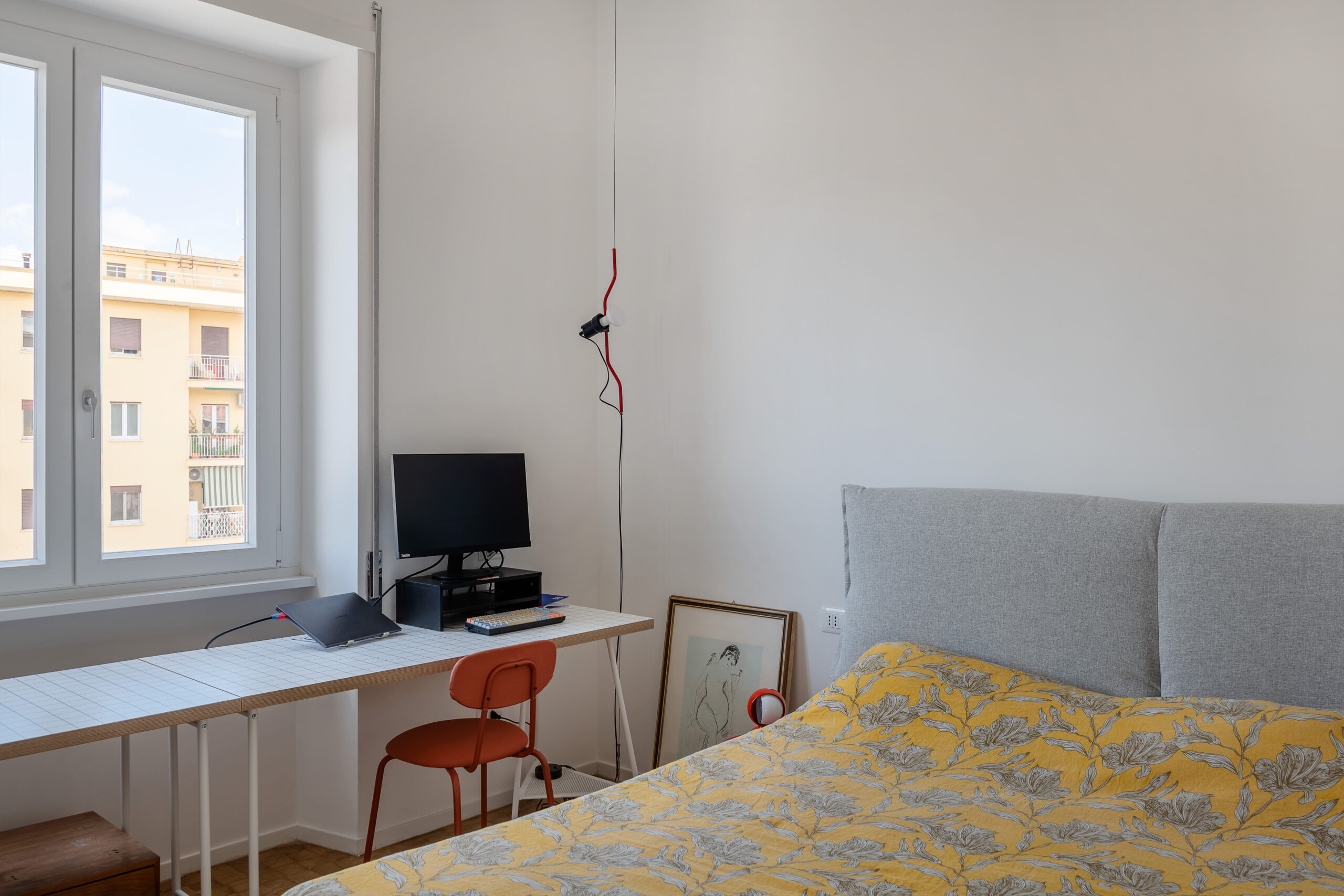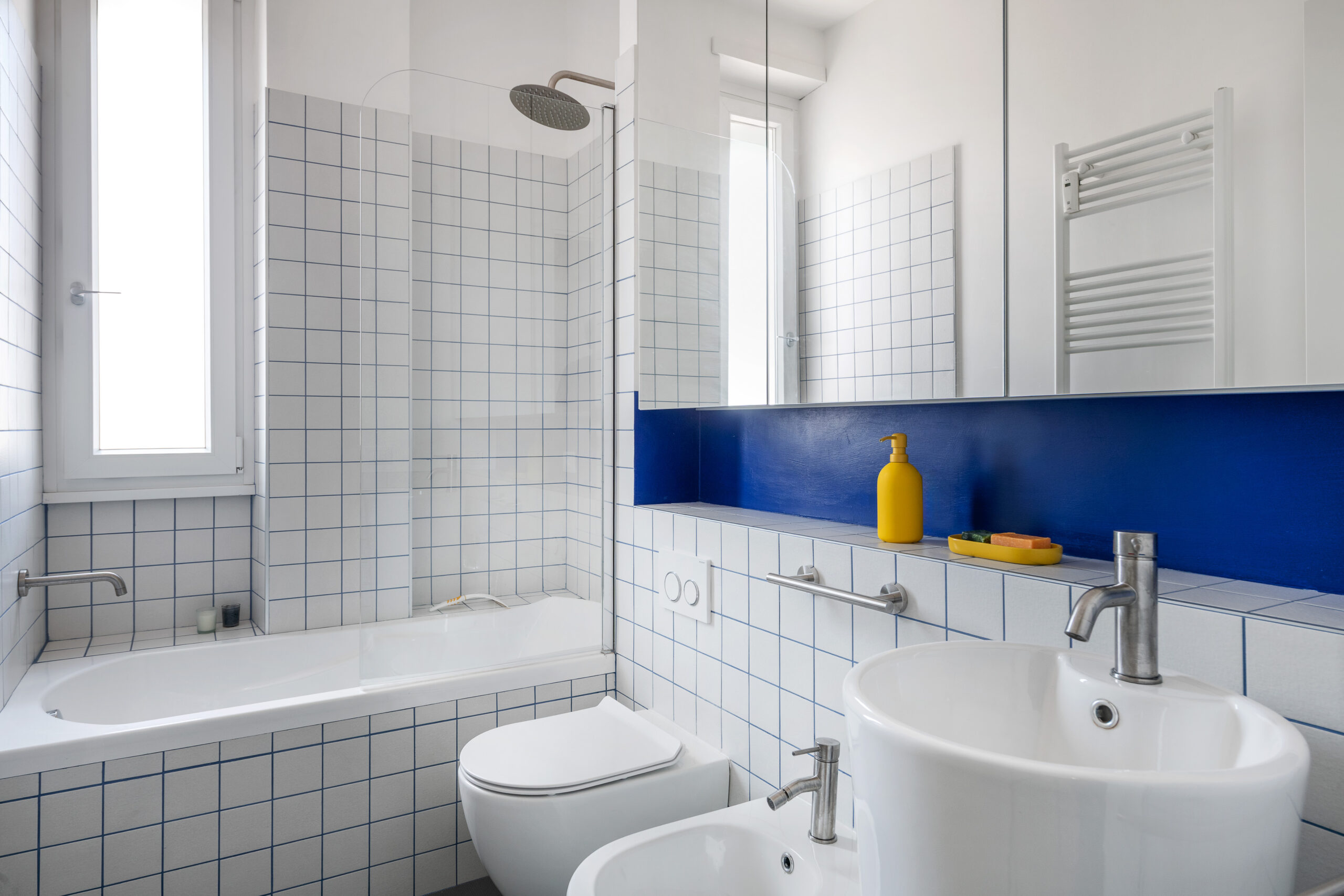 La camera da letto prosegue la coerenza stilistica dell’appartamento, prediligendo linee pulite e tonalità calde. Il bagno, essenziale ma ricercato, si distingue per l’uso deciso del colore blu primario – presente nella nicchia e nelle fughe tra le mattonelle 10×10 Mutina – e per la presenza di elementi architettonici come lo specchio contenitore che occupa una grande superficie e amplifica la percezione spaziale e il lavabo freestanding.