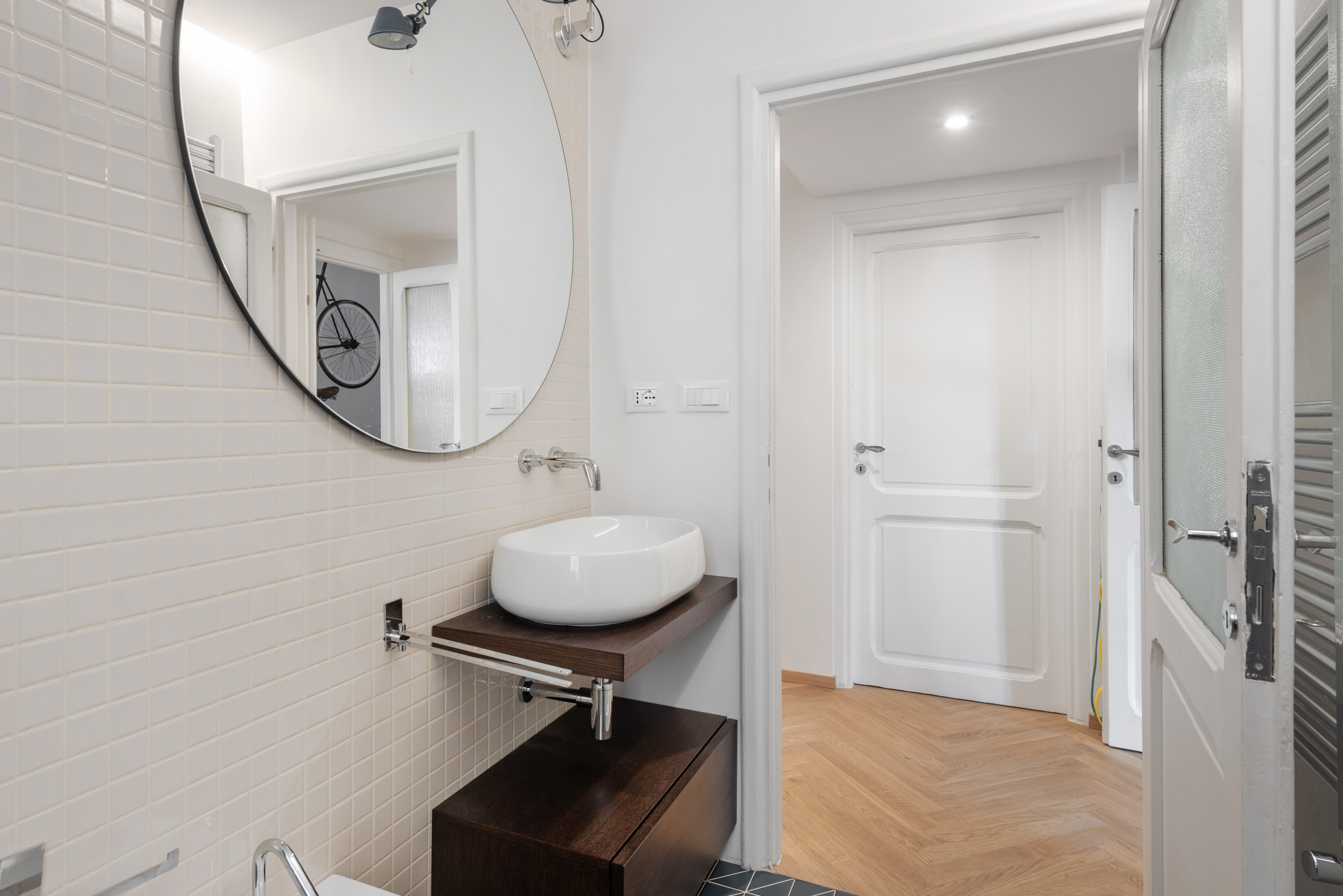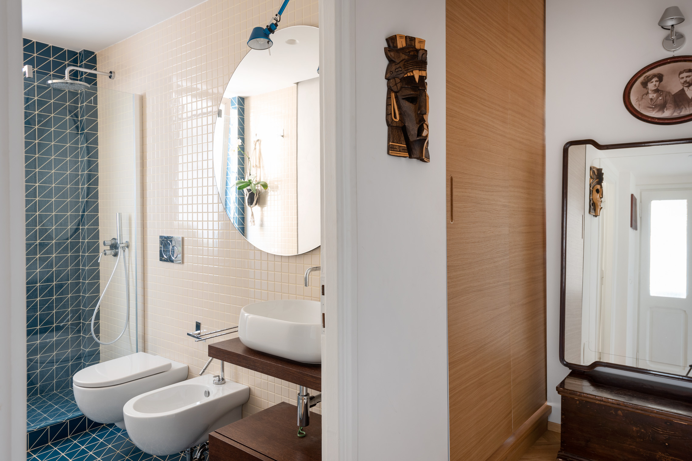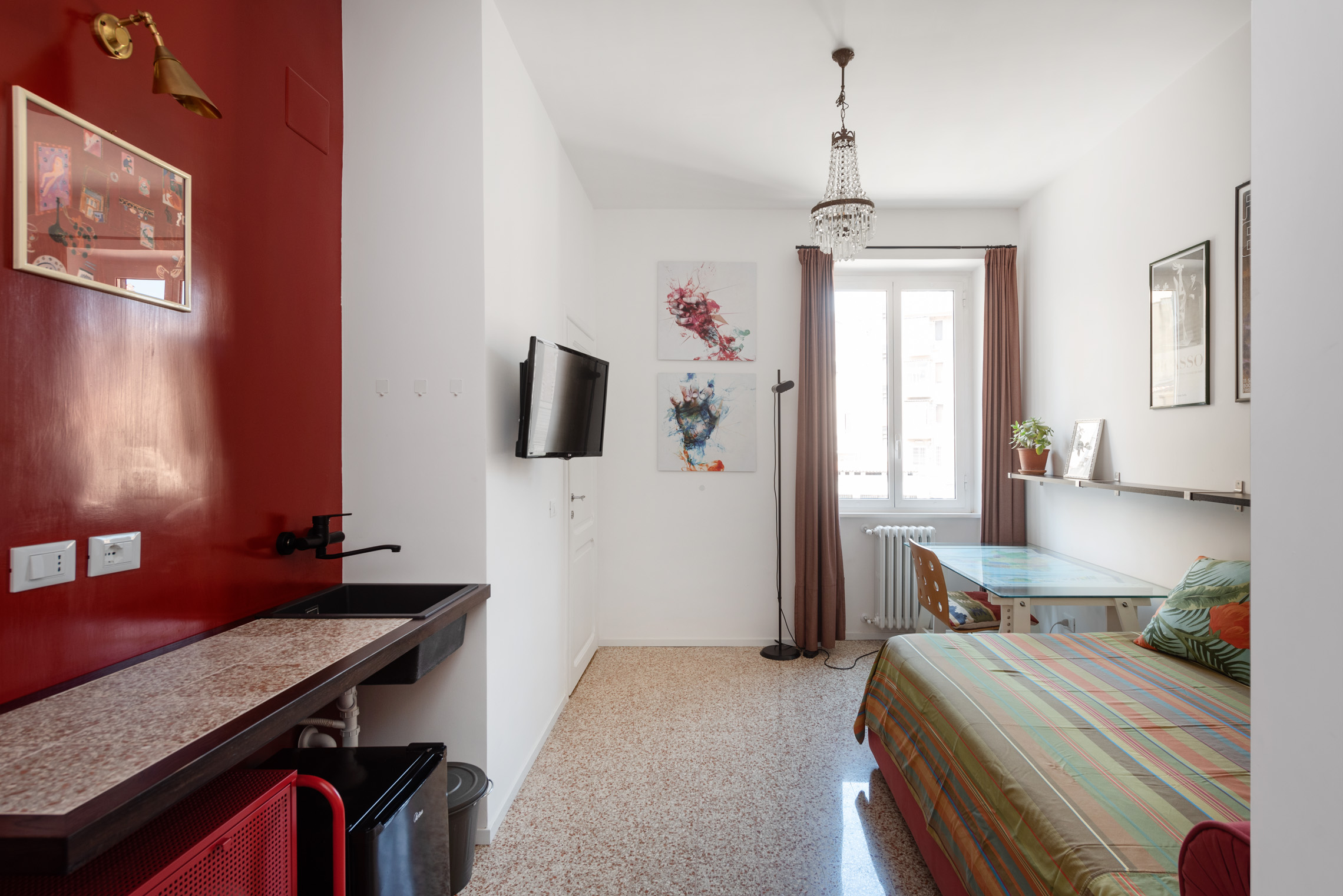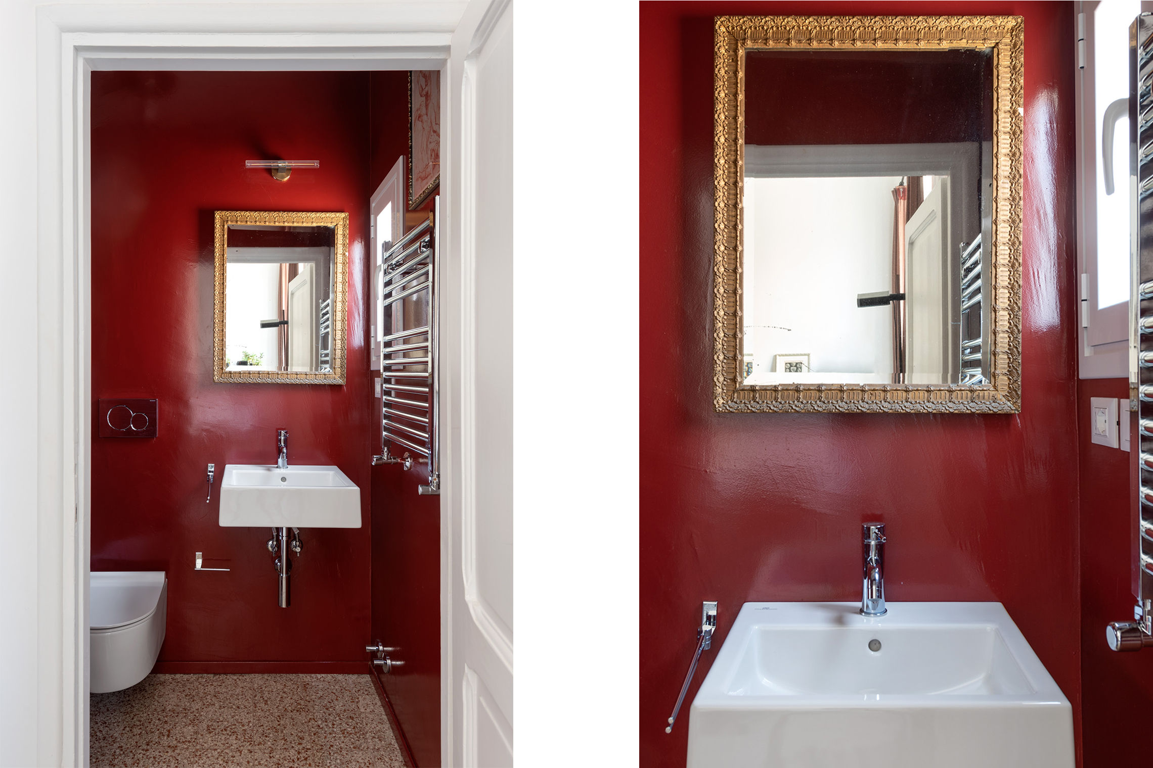 La seconda stanza con ingresso indipendente e bagno in camera, è stata progettata su richiesta della committenza come una stanza da poter mettere a reddito attraverso un affitto. La ristrutturazione di questa stanza ha seguito logiche diverse dal resto della casa, è stata più conservativa in quanto ha mantenuto le graniglie originali, di cui è composta anche la mensola snack, e sono stati riutilizzati i corpi illuminanti trovati nella casa originale. L’uso della resina color rosso pompeiano è sia un’importante connotazione cromatica dell’ambiente sia un trait d’union tra camera e bagno.