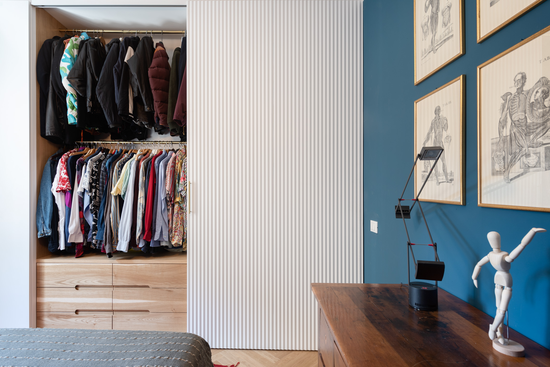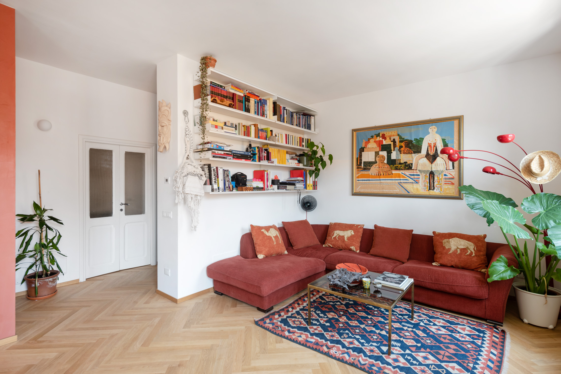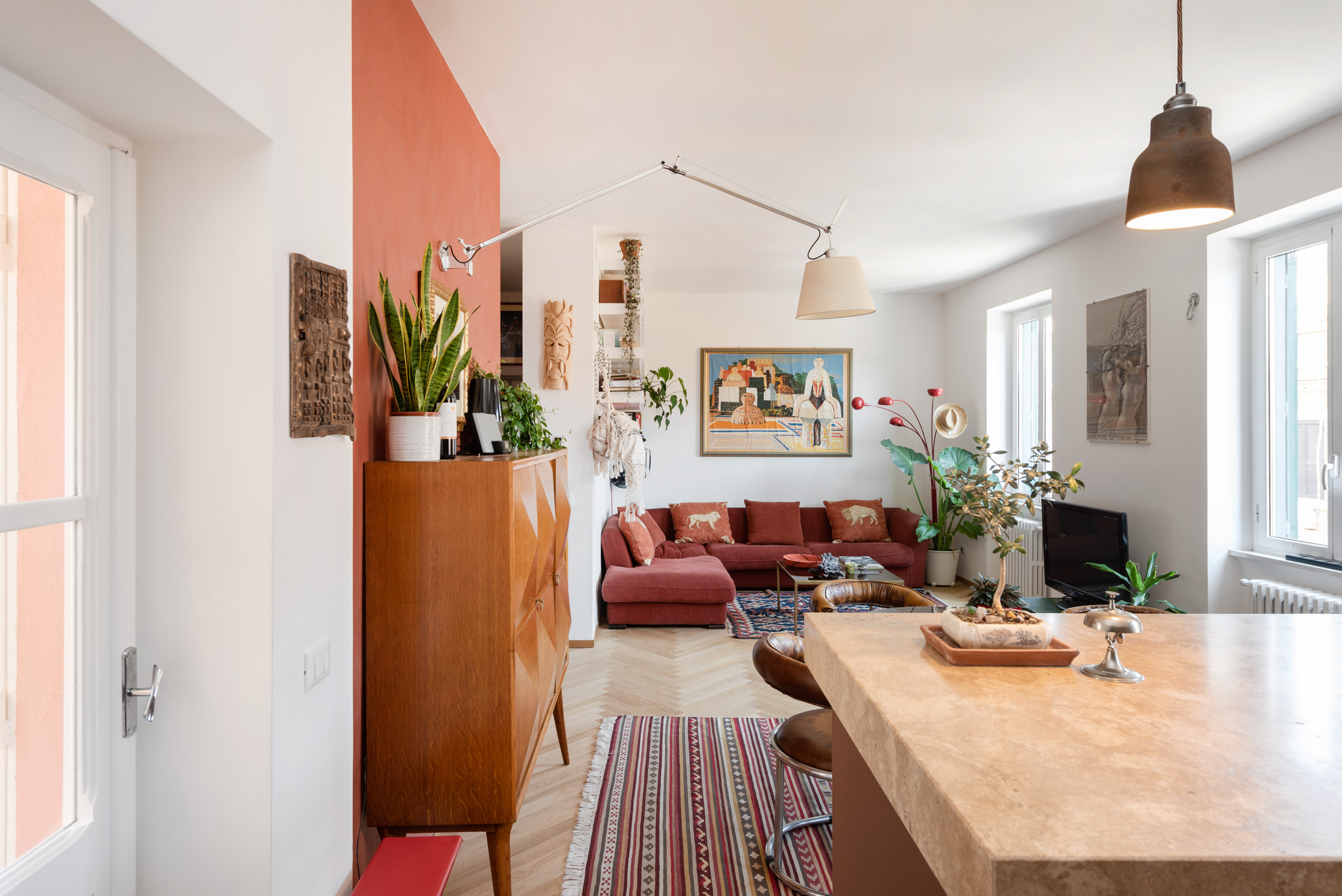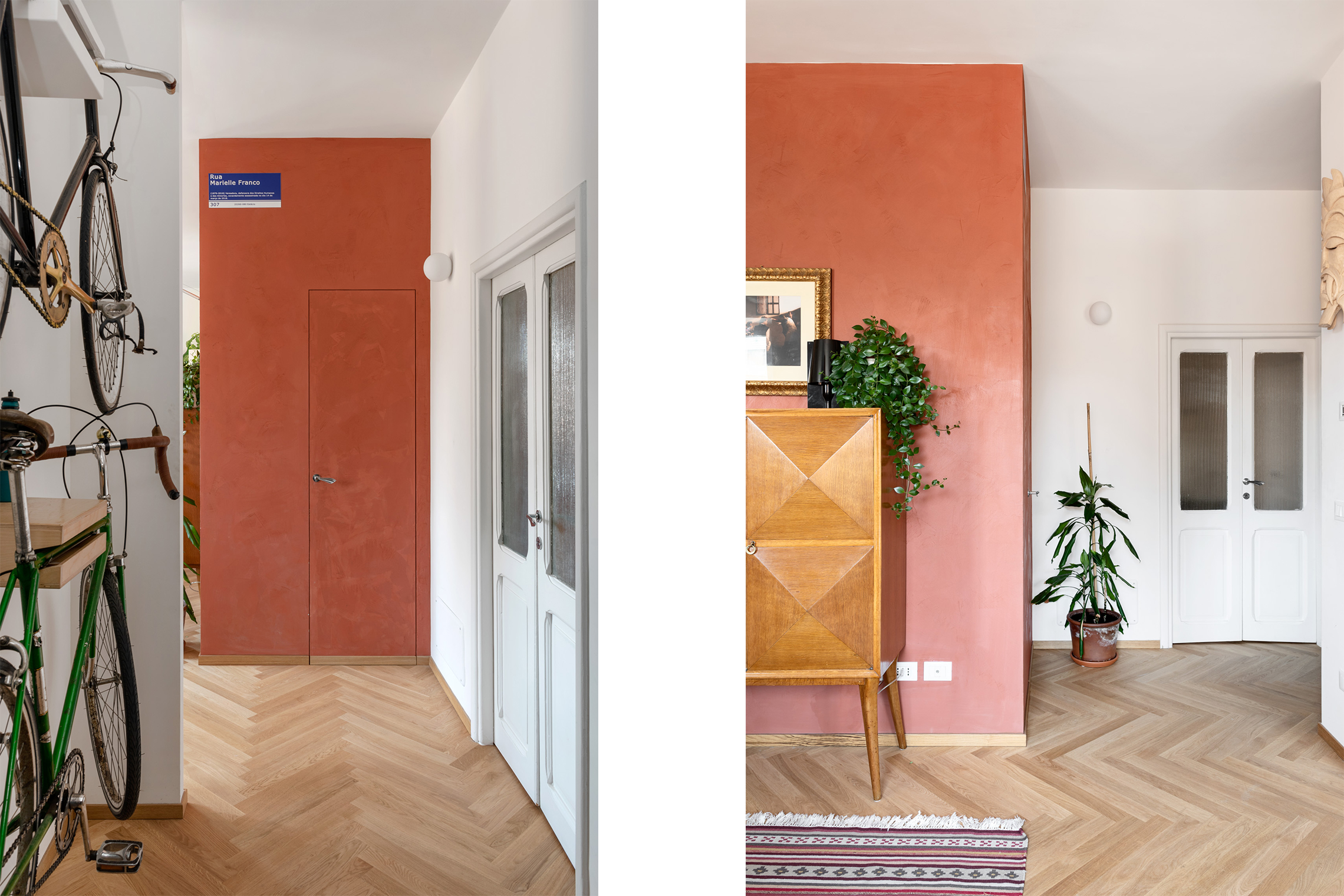 Nella zona giorno sono stati abbattuti tutti i tramezzi preesistenti che creavano le tre camere a cui corrispondevano le 3 finestre, creando un unico grande ambiente con 3 finestre in cui  si svolgono le tre funzioni di soggiorno, pranzo e cucina. L’unico nuovo volume che è stato tirato su durante la ristrutturazione è stato evidenziato dal trattamento delle sue pareti, con un marmorino color rosso mattone. Al suo interno la lavanderia / bagno di cortesia per gli ospiti. Il passaggio tra zona giorno e zona notte avviene attraverso la porta originale della casa, in legno e vetro scanalato. Nella zona notte abbiamo un’anticamera, un bagno e una camera da letto padronale.